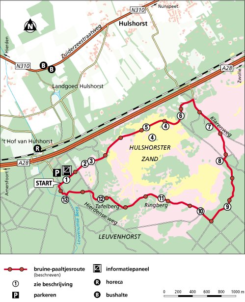 Vanaf de parkeerplaats volgt u de Hierdenseweg (zanderige bosweg) het bos in. Na circa 250 meter volgt u de bruine paaltjes naar links.
