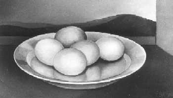 Hij vertelde me hierover: 'Ik vergeet nooit dat hij een dubbel blad wit papier pakte, daar twee witte eieren oplegde en tegen me zei: teken dat maar. Je snapt wel, bij witte eieren op een witte ondergrond, alles wit dus, kun je als je heel goed kijkt alleen maar een klein schaduwtje zien. Teken dat maar eens!'